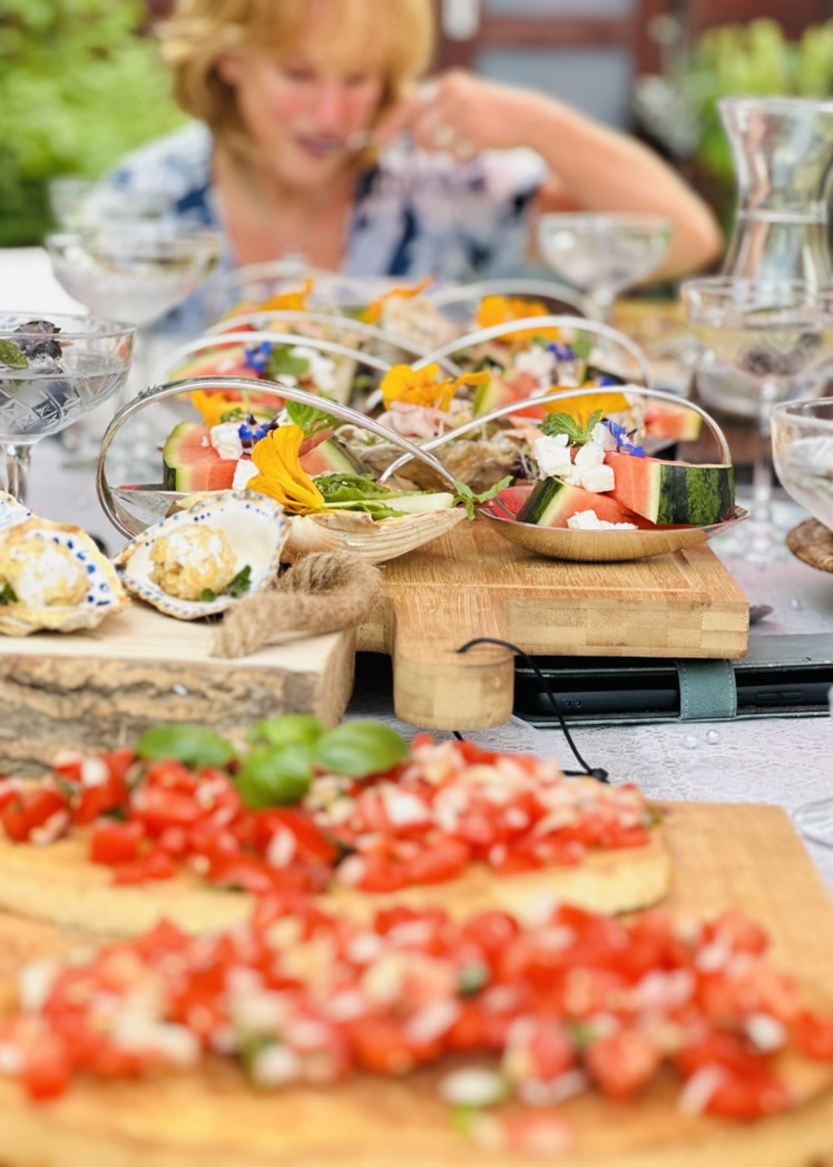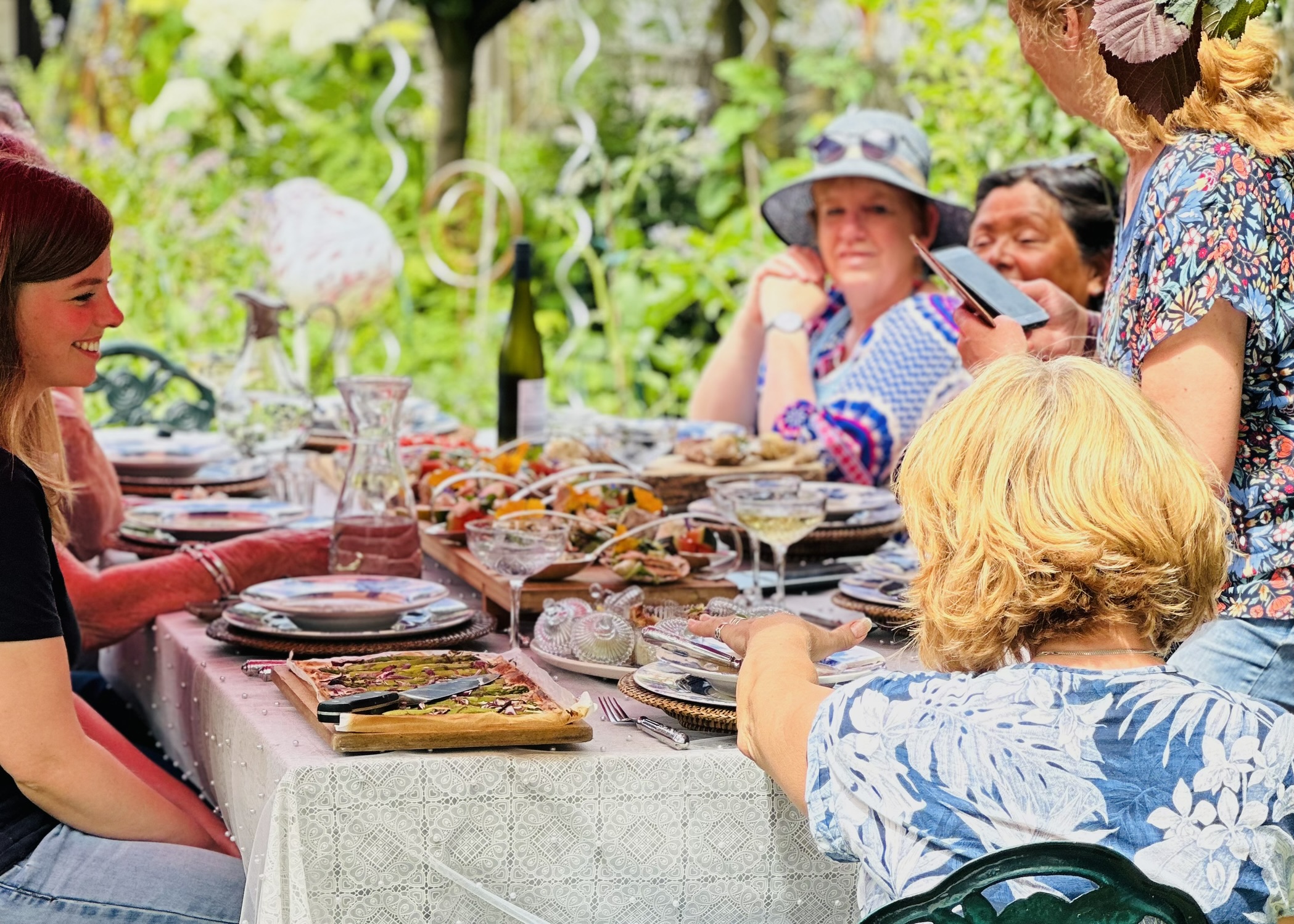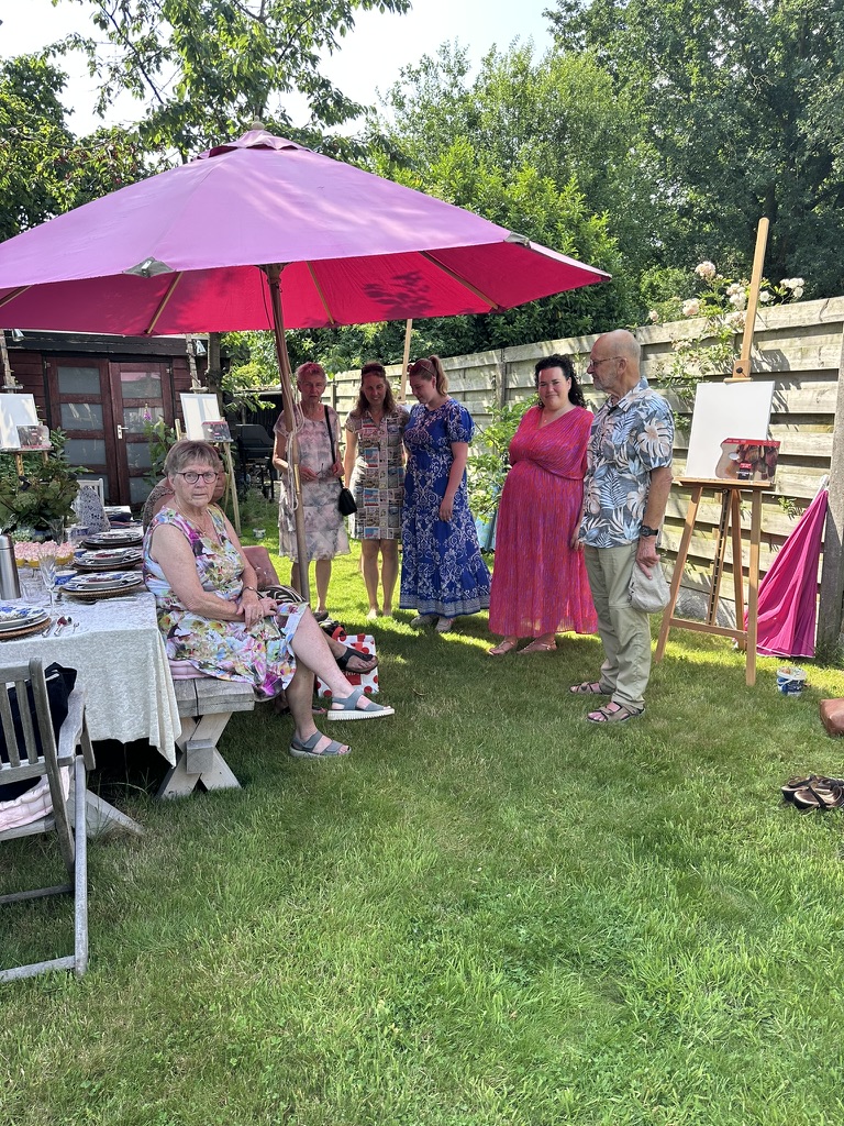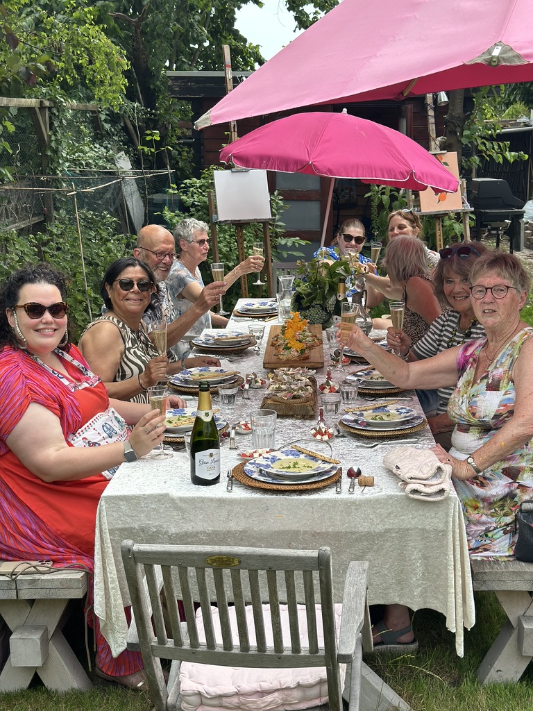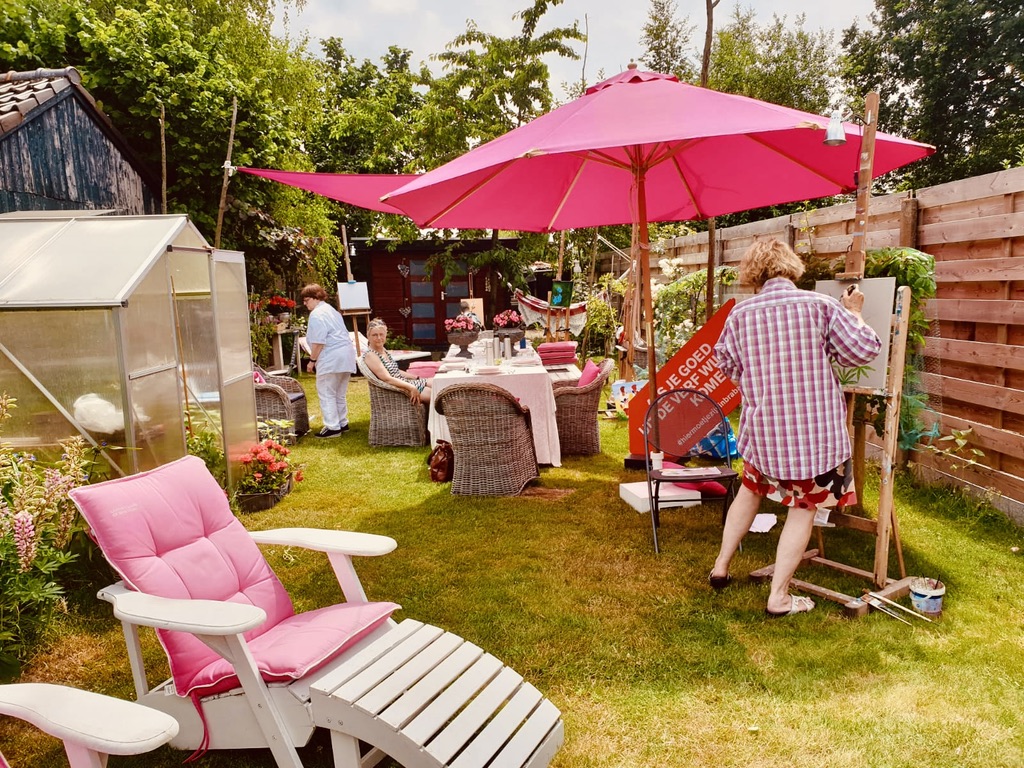 Creatief bezig zijn met elkaar in de gezellig serre van Marianne Baijens. Bij mooi weer genieten in een diepe tuin tussen alle bloemenpracht en fruitbomen.